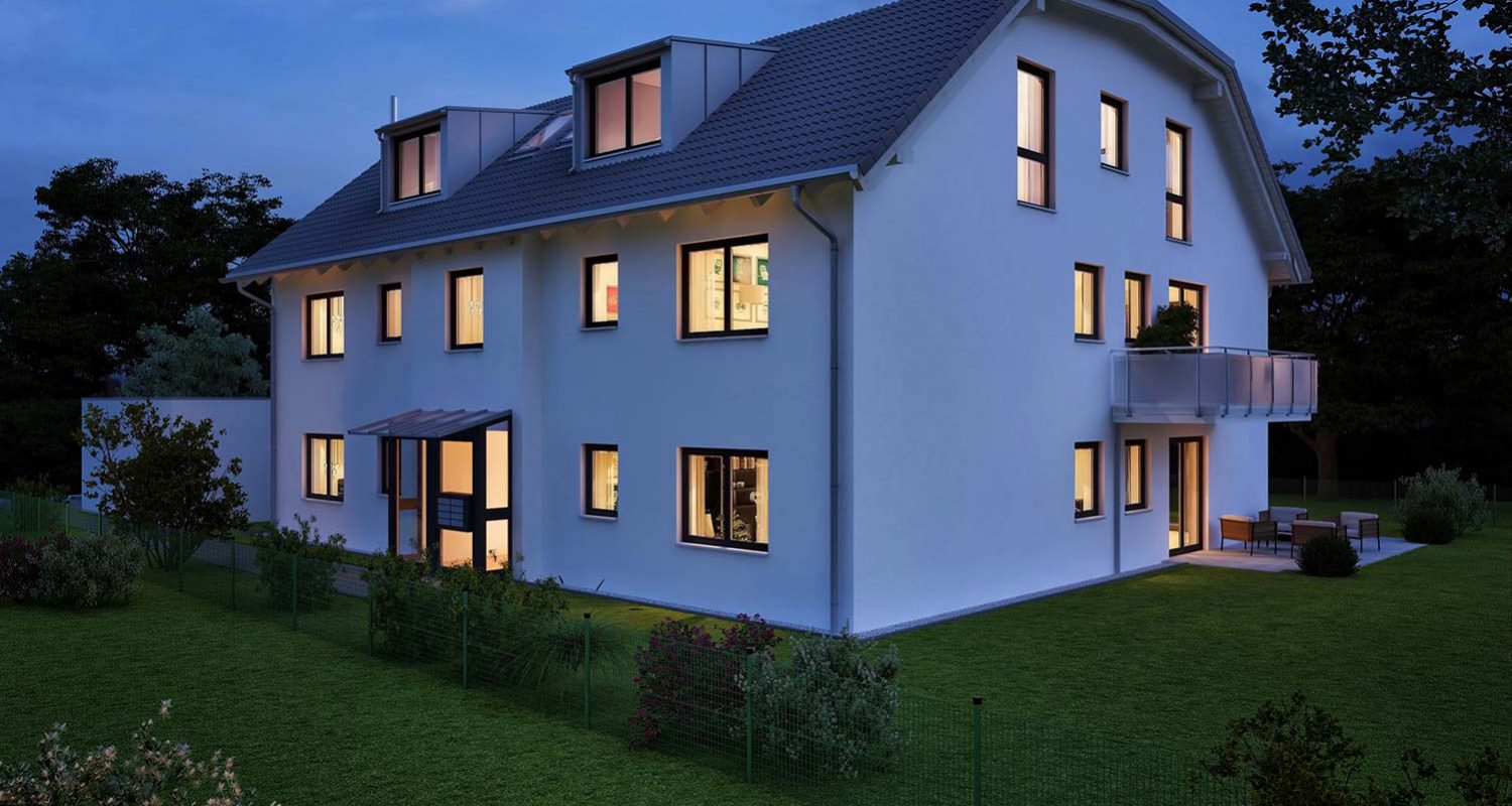 Zu den beiden Wohnungen gehören im Kellergeschoss ein Abstellraum sowie ein großzügiger Hobbyraum von ca. 35 m². Die drei Wohneinheiten im Obergeschoss erfreuen die Bewohner mit jeweils einem Balkon, der an den sehr großzügigen Wohn-, Koch- und Essbereich angrenzt. Im Dachgeschoss hat jede der beiden Wohneinheiten eine Terrasse und eine der beiden ein Kinderzimmer. Ein stattliches, behütendes Mansardendach. Fenster mit elektr. Rollläden in denen sich die grüne Umgebung spiegelt.